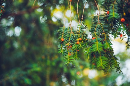 Yew Taxus baccata Fastigiata Aurea English yew, European yew new bright green with yellow stripes foliage in spring garden as natural background. selective focus.