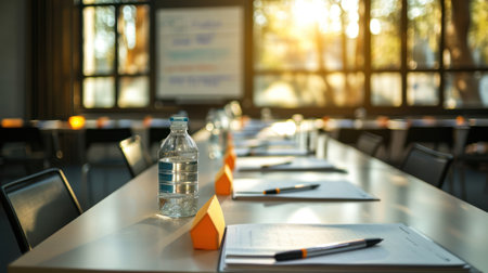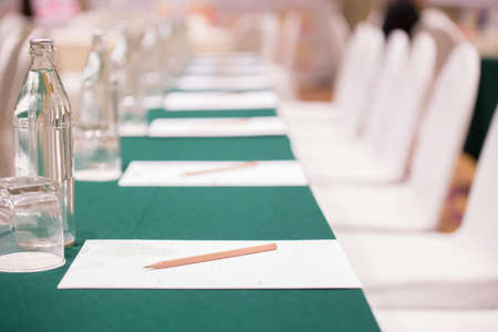 Paper, pencil, water bottle, glass on the table in the seminar room background.