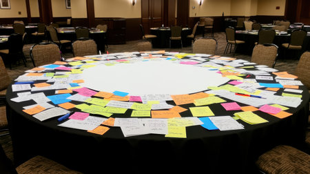 A round table is covered in colorful sticky notes and paper, showcasing an organized brainstorming session in a professional conference room setting.