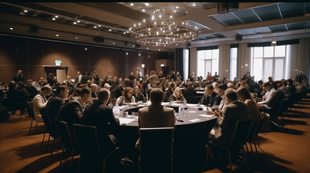 Group of professionals attending a seminar in a bright, modern conference room. Participants are focused and engaged, highlighting teamwork and collaboration in a corporate environment.
