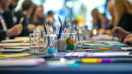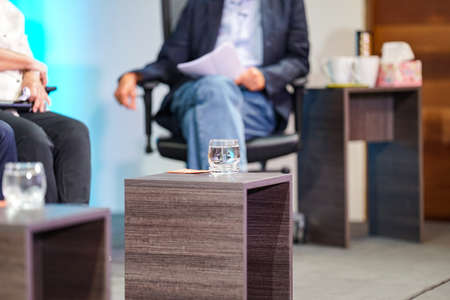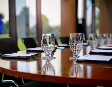 A close-up view of a glass on a table in a conference setting, featuring blurred backgrounds with soft lighting, creating an inviting atmosphere for business events.
