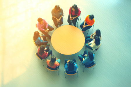 An overhead view shows a diverse group of people seated in a circle. They are likely gathered for a meeting, workshop, or collaborative discussion. The composition highlights a neutral color palette, featuring natural light, and a minimalist style. Suitable for editorial and commercial applications related to teamwork, and community.