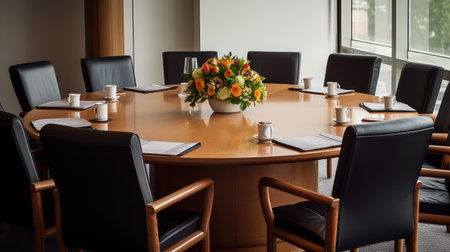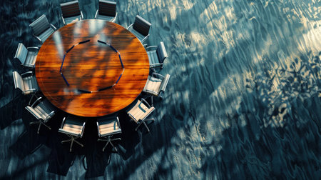 A top down view of circular boardroom table surrounded by leather chairs, creating professional and inviting atmosphere for meetings..