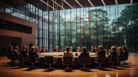 A top down view of circular boardroom table with leather chairs, surrounded by plants, creating professional and inviting atmosphere for meetings..