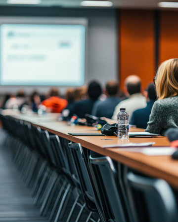 Attendees focus on a presentation at a professional conference in a modern venue, seated at long tables with notebooks and water bottles in view.