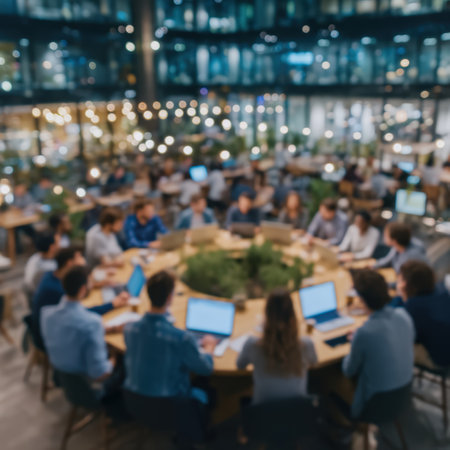 Group of professionals engaged in a collaborative meeting around a table with laptops in a modern office setting