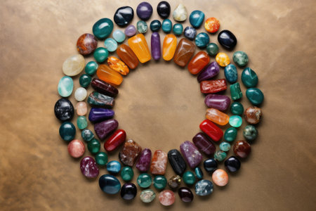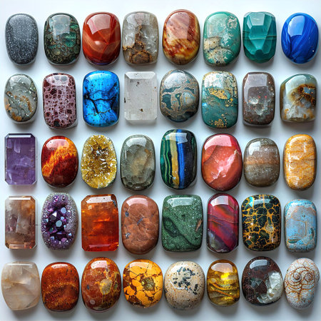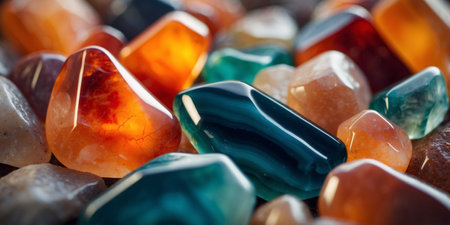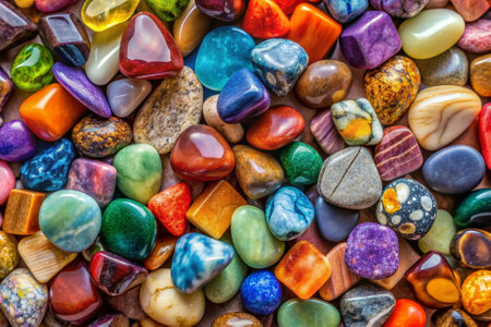 Radiant and small healing stones arrayed in a pattern, shimmering with intense colors and fascinating natural lines.. AI generated.