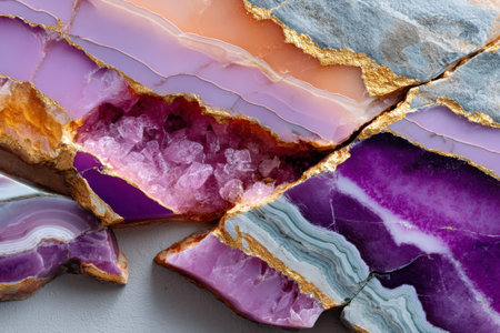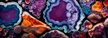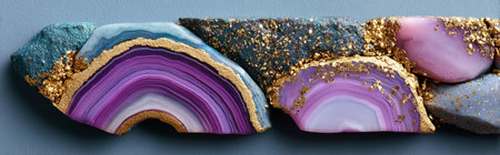 Intricate layers of agate stone display a vivid spectrum of purple, pink, and blue hues, showing shimmering crystals and smooth surfaces that highlight natural artistry.