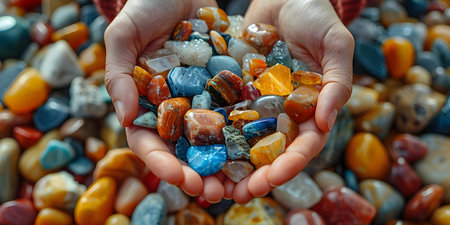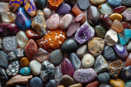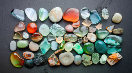 A stunning arrangement of vibrant gemstones in various colors highlights their unique shapes and natural beauty, creating a visually appealing and tranquil composition.