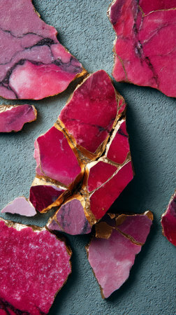 Fragmented view of burgundy marble showing cracked edges, layered pink surfaces and contrast with black inlay.