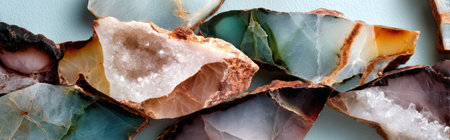 Top-down photo of semiprecious stones with clear white centers, colorful crystals, and rough edges arranged on a soft blue surface.
