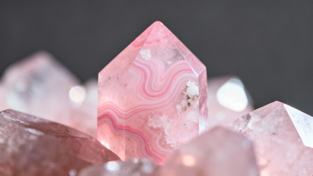 Pink quartz geode crystals on black background. Macro shot with shallow depth of field