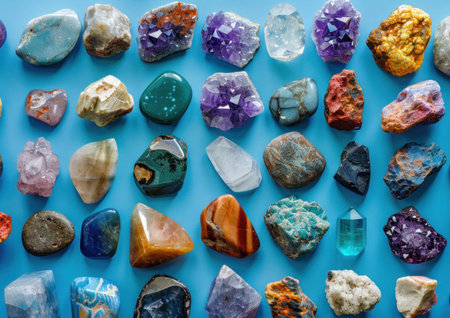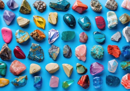 Colorful array of various gemstones arranged on a blue background, showcasing their unique shapes, colors, and textures. Decorative and natural elements.