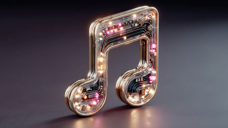 A glowing music note symbol is presented against a dark backdrop, featuring intricate circuits and radiant lighting effects. The design showcases a technological integration, possibly representing digital audio. This graphic could be used for various media, including website design, promotional materials, and educational presentations, or as an icon.