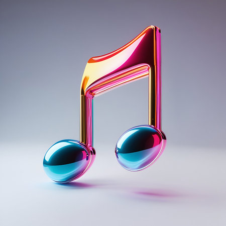 3D illustration of a vibrant musical note symbol, reflecting colors and light, set against a soft gradient background, embodying the essence of music and dance