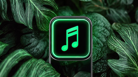 An illuminated smartphone displays a music note icon, centrally positioned against a backdrop of dark green leaves. The composition highlights a modern technology concept, with a minimalist, clean aesthetic. The lighting suggests an artistic or digitally generated visual suitable for promotional media and editorial design.