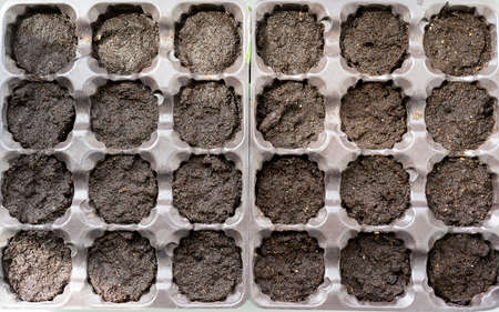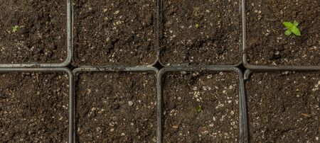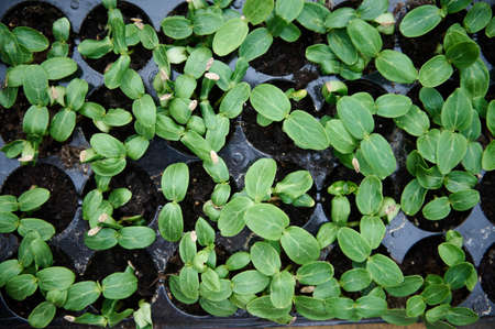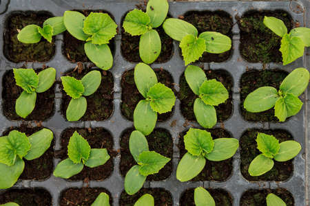 Overhead view of sprouts growing from zucchini pips, cultivated in black soil in cassette in greenhouse conditions for further planting into a ground in the open field