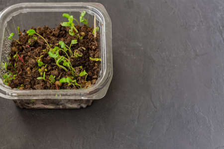 Growing microgreens in plastic container. Healthy macrobiotic food at home. copy space for text