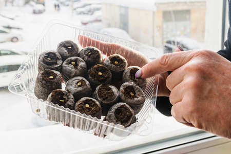 A woman plants seeds of plants in peat tablets to obtain seedlings.