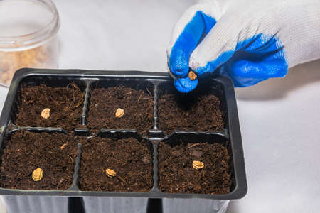 Female hand planting seeds in seedling tray with soil. Gardening and growing vegetables at home. Agriculture growing preparation process.