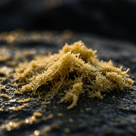 An abstract close-up of golden powder and crumbs scattered on a dark background, creating a textured and visually intriguing composition with a dramatic effect.