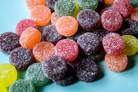 Assorted colorful fruit jelly candies on blue background. Copy space.