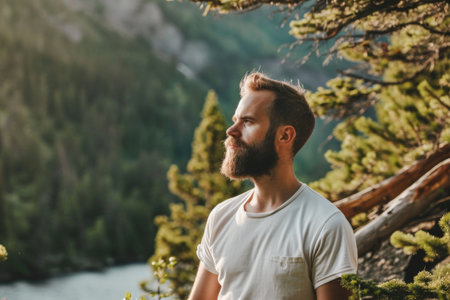Bearded Man Standing in Woods, Serene Escape Amidst Natures Embrace
