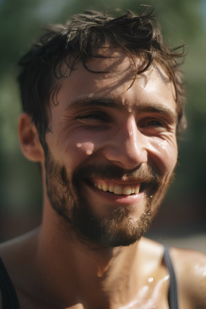 A cheerful young cute man 30 years old, resident of USA, with short hair and a well-kept beard smiles warmly while wearing a casual wear. Soft lighting enhances the friendly atmosphere. Generative AI.