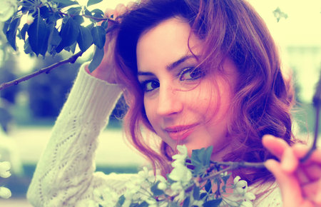 Beautiful young girl is resting and enjoying spring in the spring park.