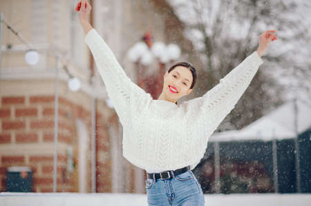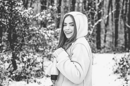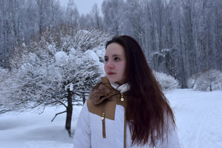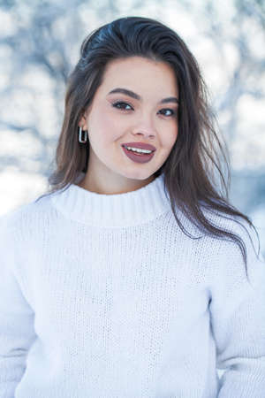 Beautiful winter portrait of young woman in the winter snowy scenery