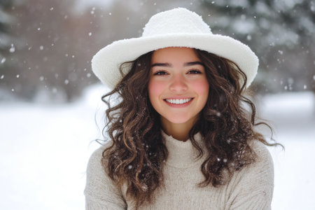 A young blonde woman in a brown coat smiles softly, surrounded by falling snow.