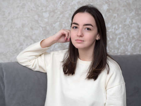 girl in a white sweater smiles affectionately propping her cheek with her hand in the background wood