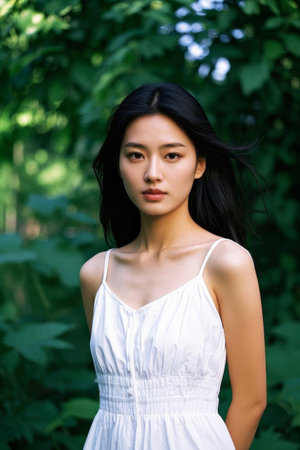 A young Asian woman with her hair in a bun, wearing a traditional white dress, poses for a portrait amidst lush green foliage.