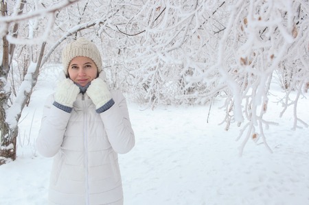 pretty woman in a white coat in a hat winter landscape walk Fresh air