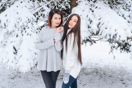 two asian women outdoor in winter snowfall, lifestyle people concept