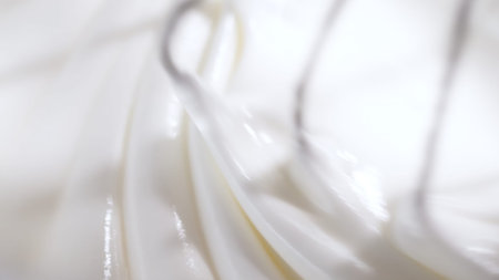Mixing of cream and sugar in a bowl with a whisk during a baking session