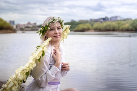 Nice blonde girl with white flower wings on the beach near river in cloudy day