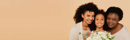 happy african american family of mother, daughter and grandmother hugging and holding bouquet of flowers isolated on beige, banner