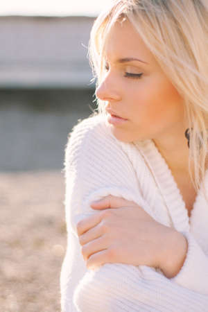 Portrait of pretty young woman posing on the Baltic sea beach in autumn