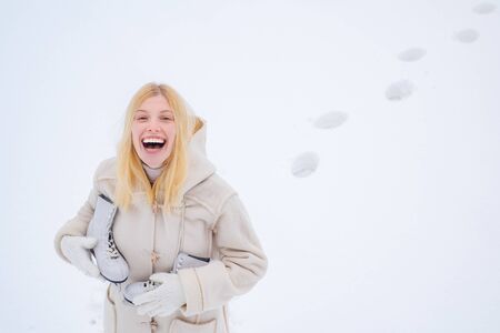 Young blond beautiful female with white ice skates in her hand in winter snowy forest.