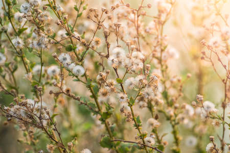 Dry Flowers Of Conyza Sumatrensis. Guernsey Fleabane, Fleabane, Tall Fleabane, Broad-leaved Fleabane, White Horseweed, And Sumatran Fleabane. Close Up Autumn Grass And Flowers In Sunset Sunrise Sunlight.