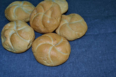 Many rolls of the same size and type from a traditional bakery lie next to each other, all baked in the oven in white wheat flour.