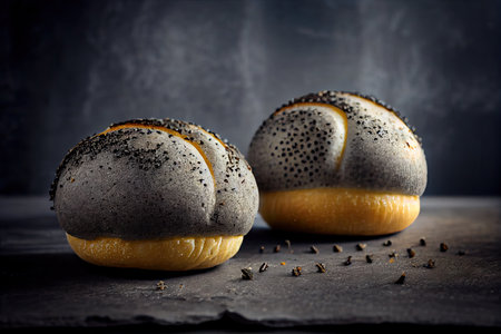 delicious homemade poppy seed buns on gray stone background, created with generative ai