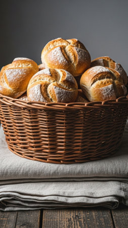 A stack of freshly baked buns against a rustic background, perfect for showcasing delicious snacks or meals in a kitchen or bakery setting.