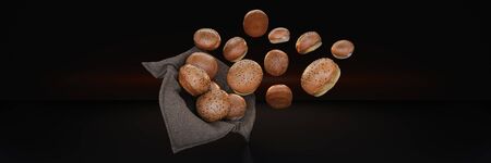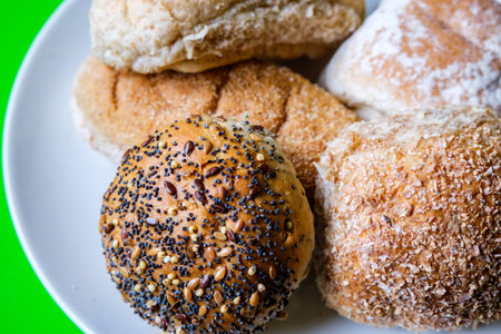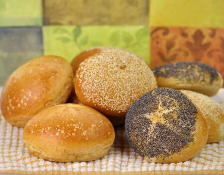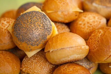 Assorted round homemade brioche buns with seeds on a colorful background with high contrast light