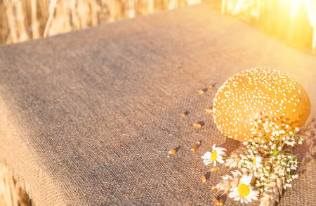 bread bun with sesame seeds lying on a table with flowers of daisies and ears of wheat against the background of a wheat field.