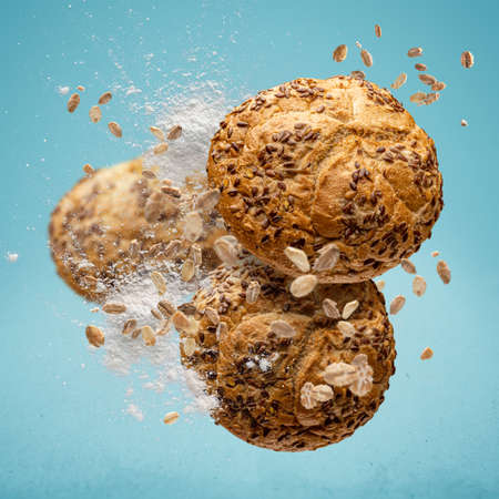 Multigrain mini bread in white plate on blue background. Flat lay, top view. Brown bread with different seeds - chia, pumpkin, flax, sesame. Small loafs.