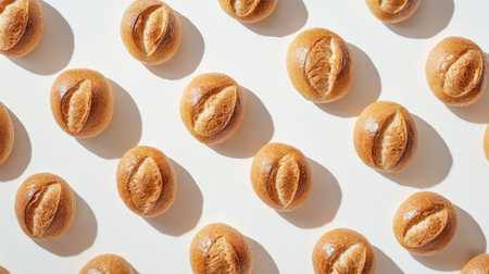 A close-up view of freshly baked round bread loaves arranged neatly on a white background. The soft golden crust showcases a delightful texture, making this image perfect for culinary themes.