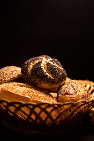 A bun with poppy seeds is in a basket with bread. Poppy filling. High quality photo