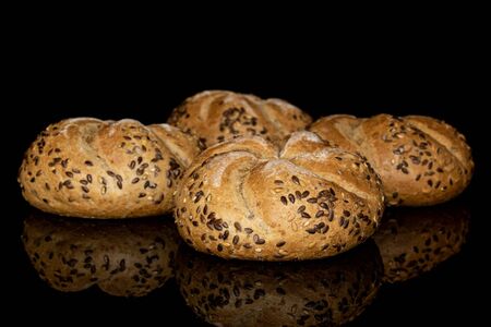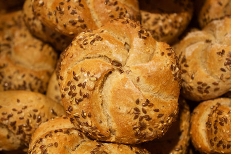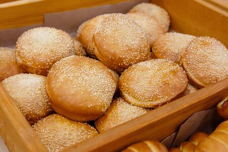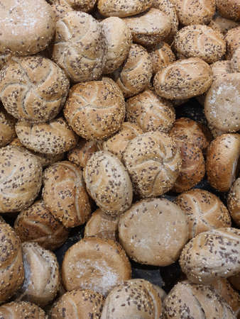 Freshly baked round bread rolls or Kaiser rolls, buns with sesame, flax seeds and linseeds in a bakery or grocery store